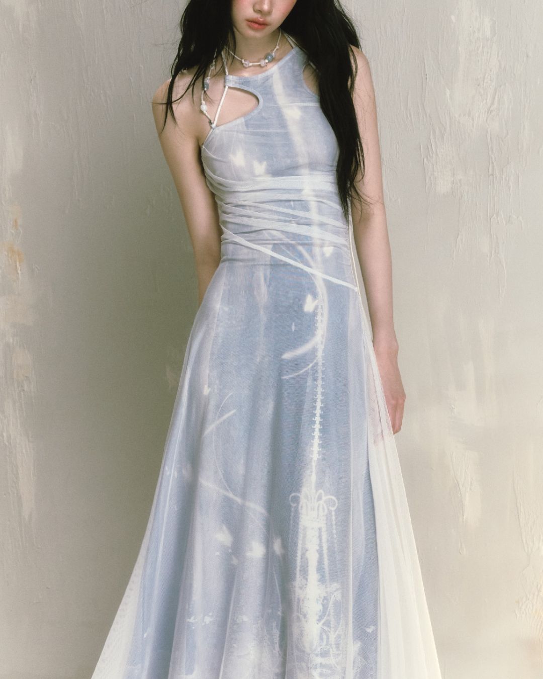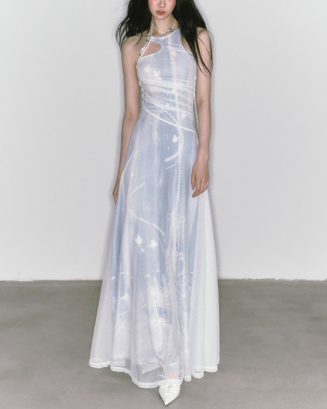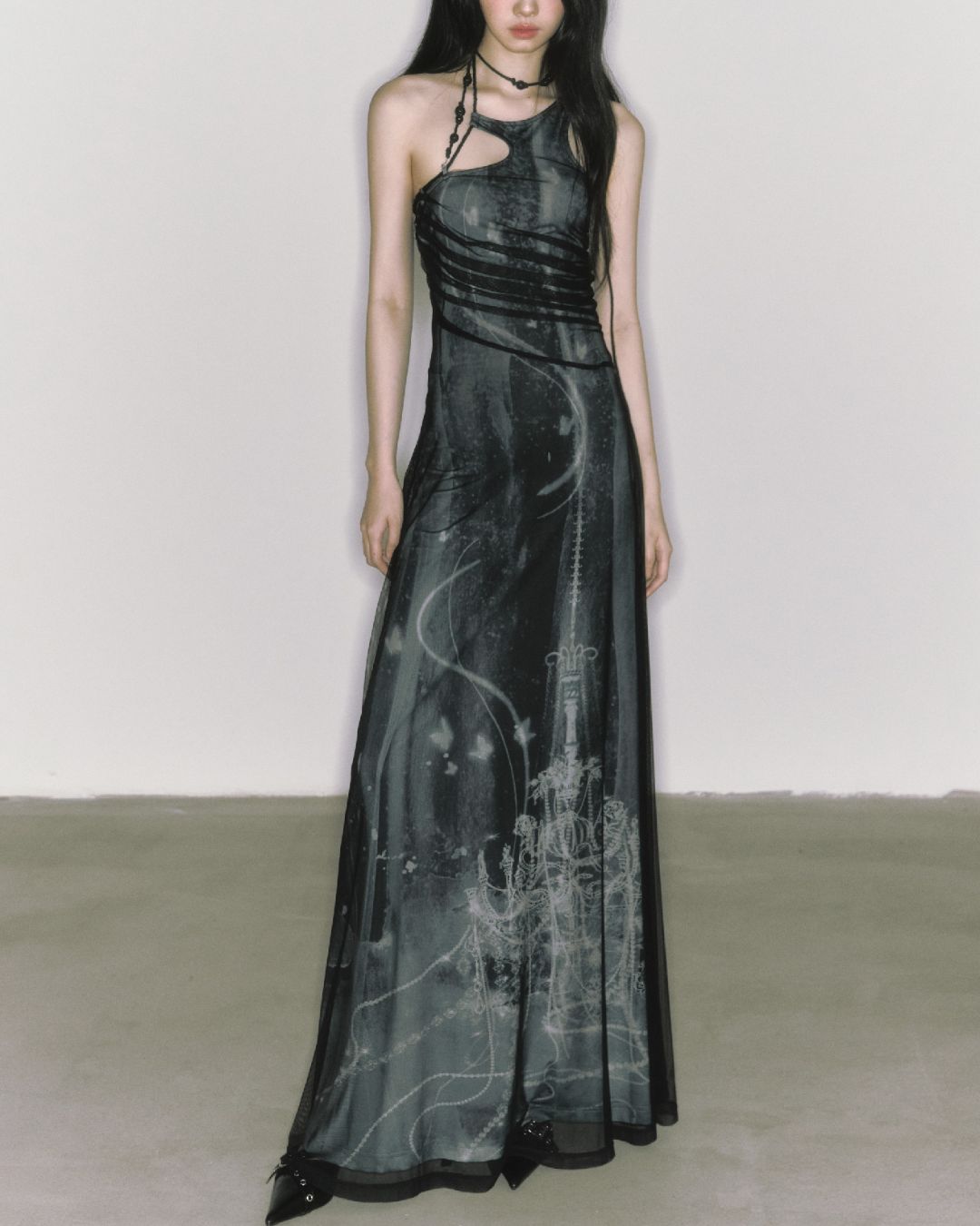 Mesh Print Beaded Halter Neck Long Dress DR014