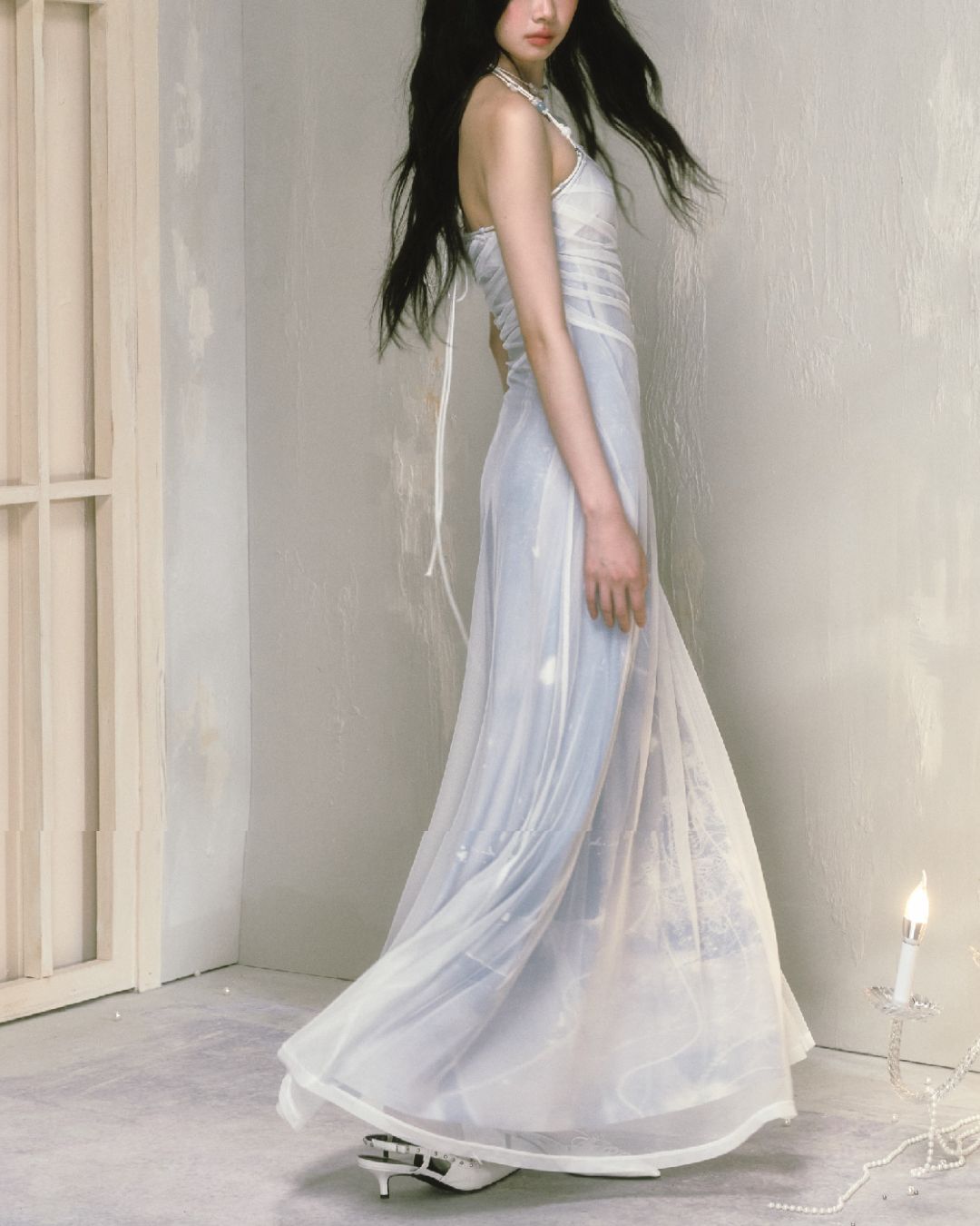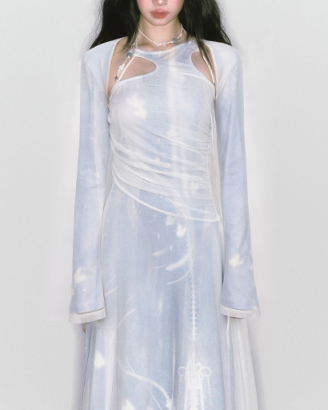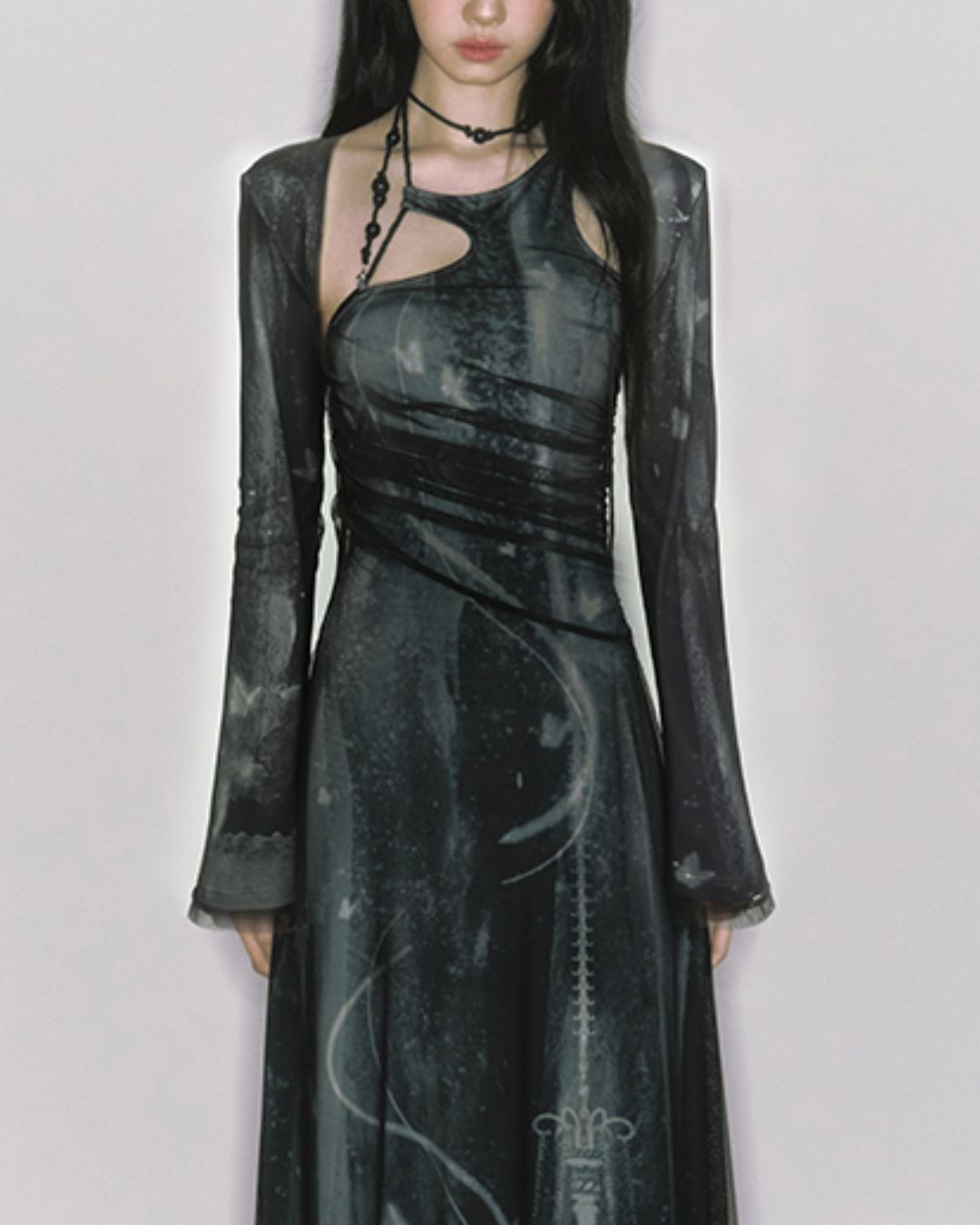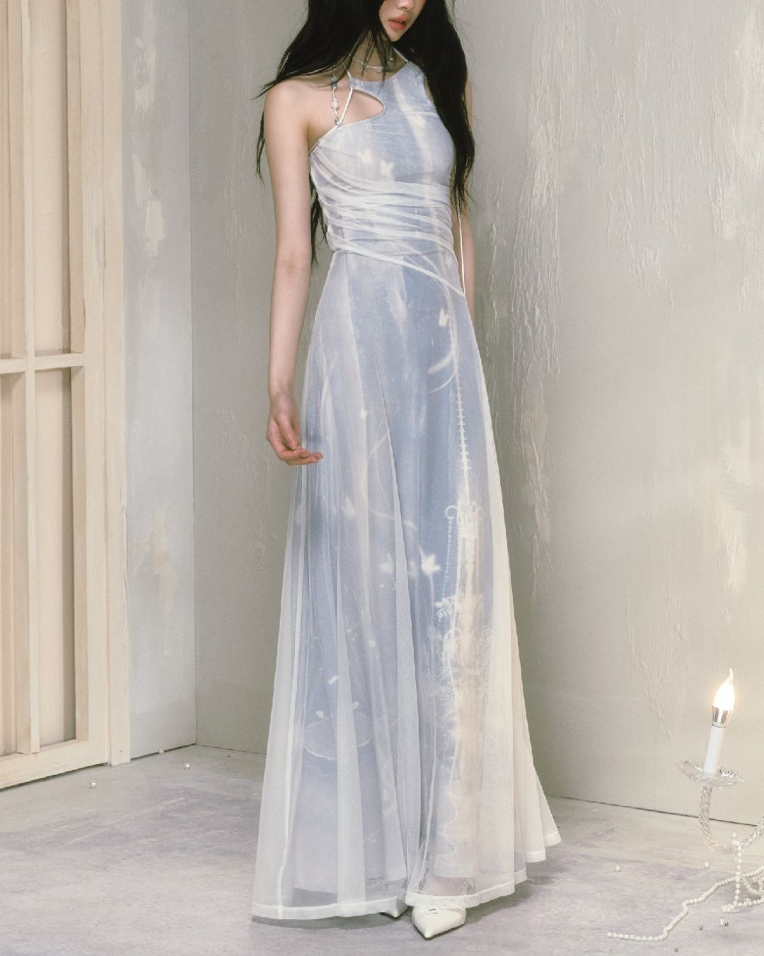 Mesh Print Beaded Halter Neck Long Dress DR014
