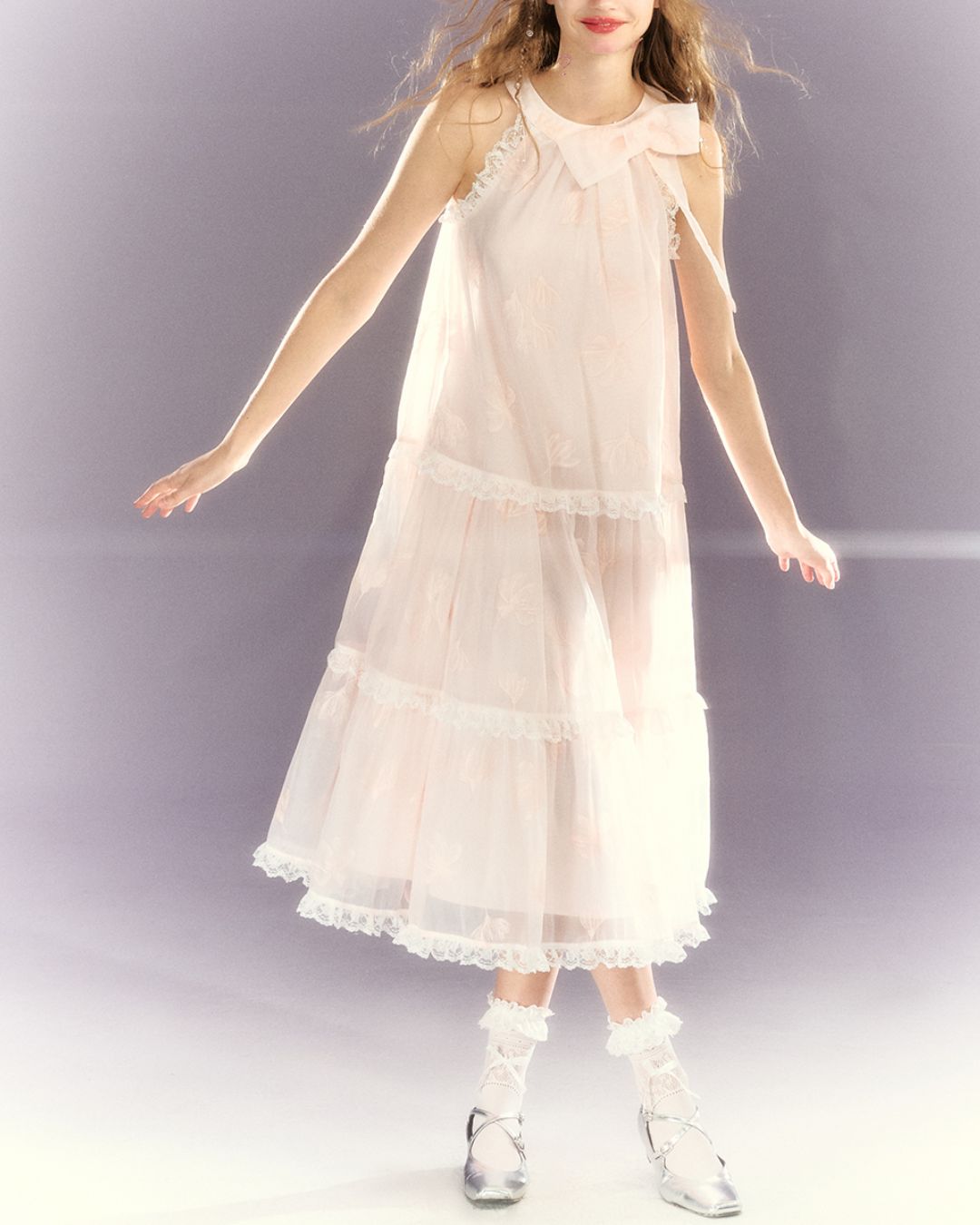 Halter Neck Floral Tiered Lace Long Dress DR025