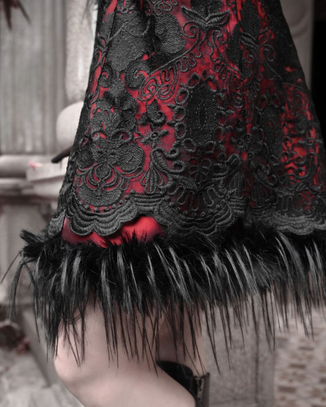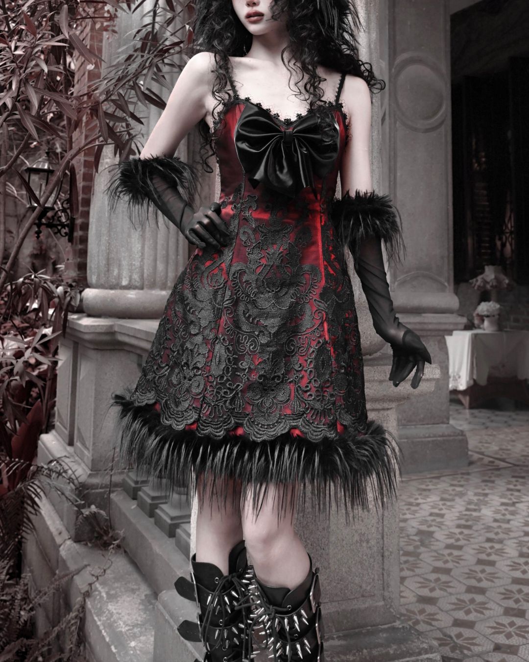 素材: レッド生地 レーヨン78% ナイロン22% / レース生地 ポリエステル100% / ファー部分 ポリエステル100% / リボン部分 PU100%