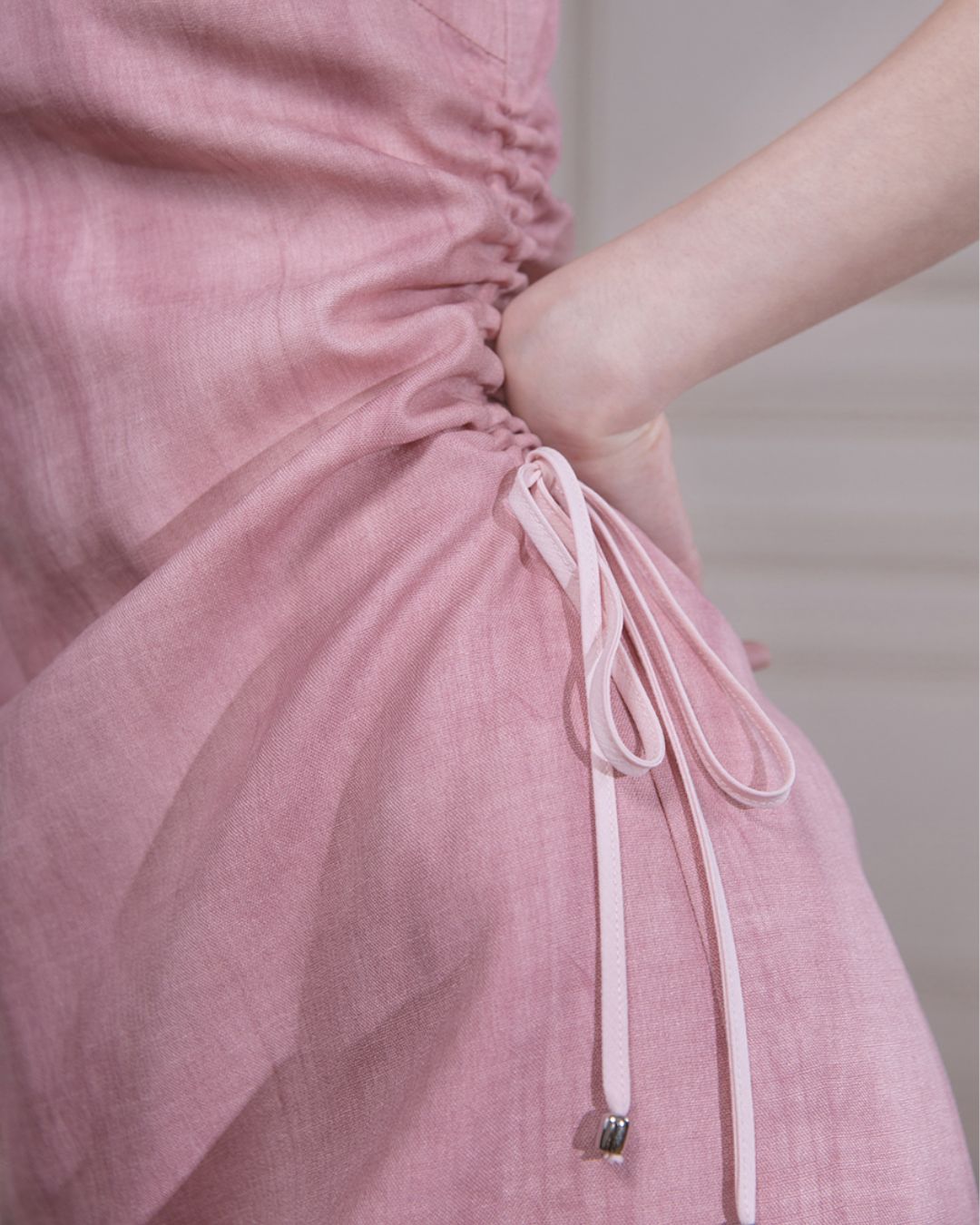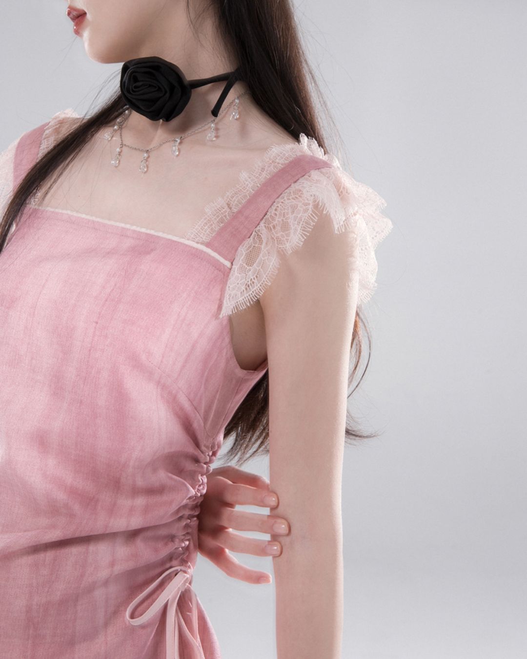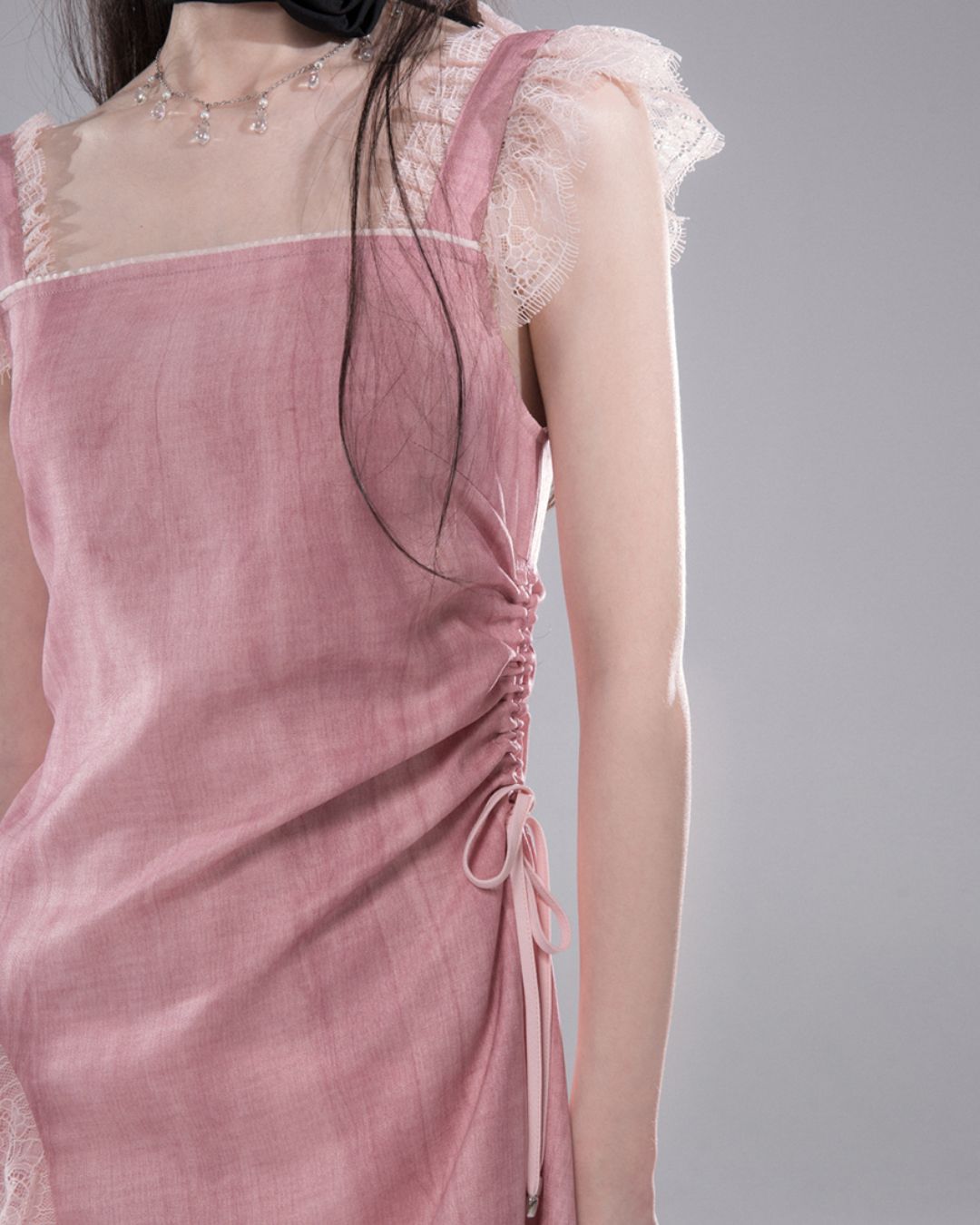 Side Waist Drawstring Lace Embellished Long Dress DR042