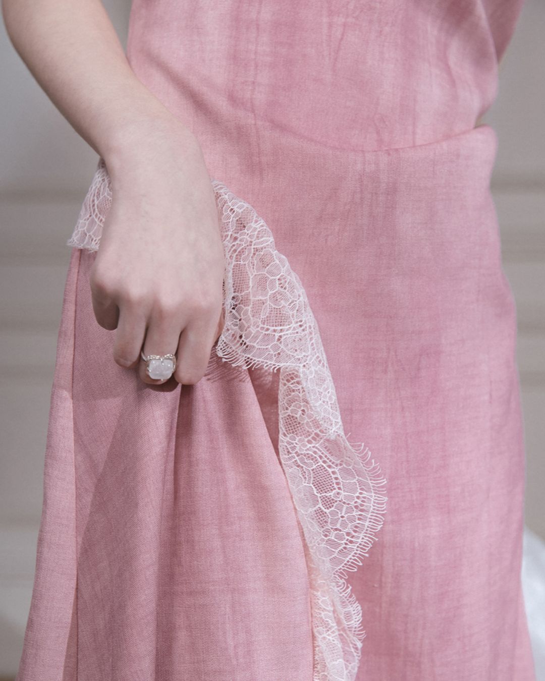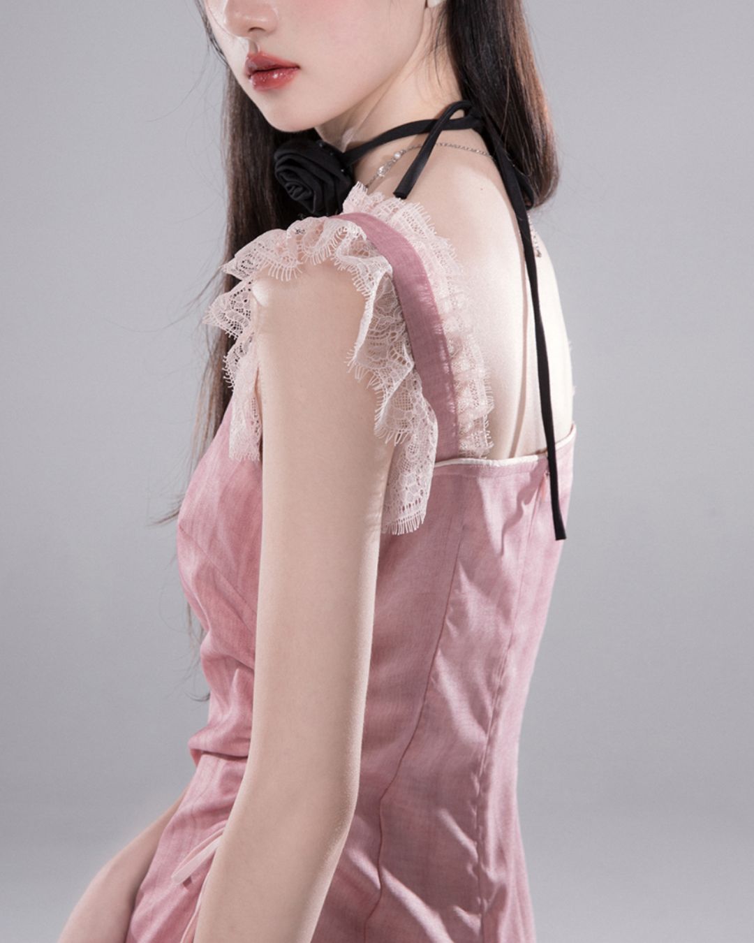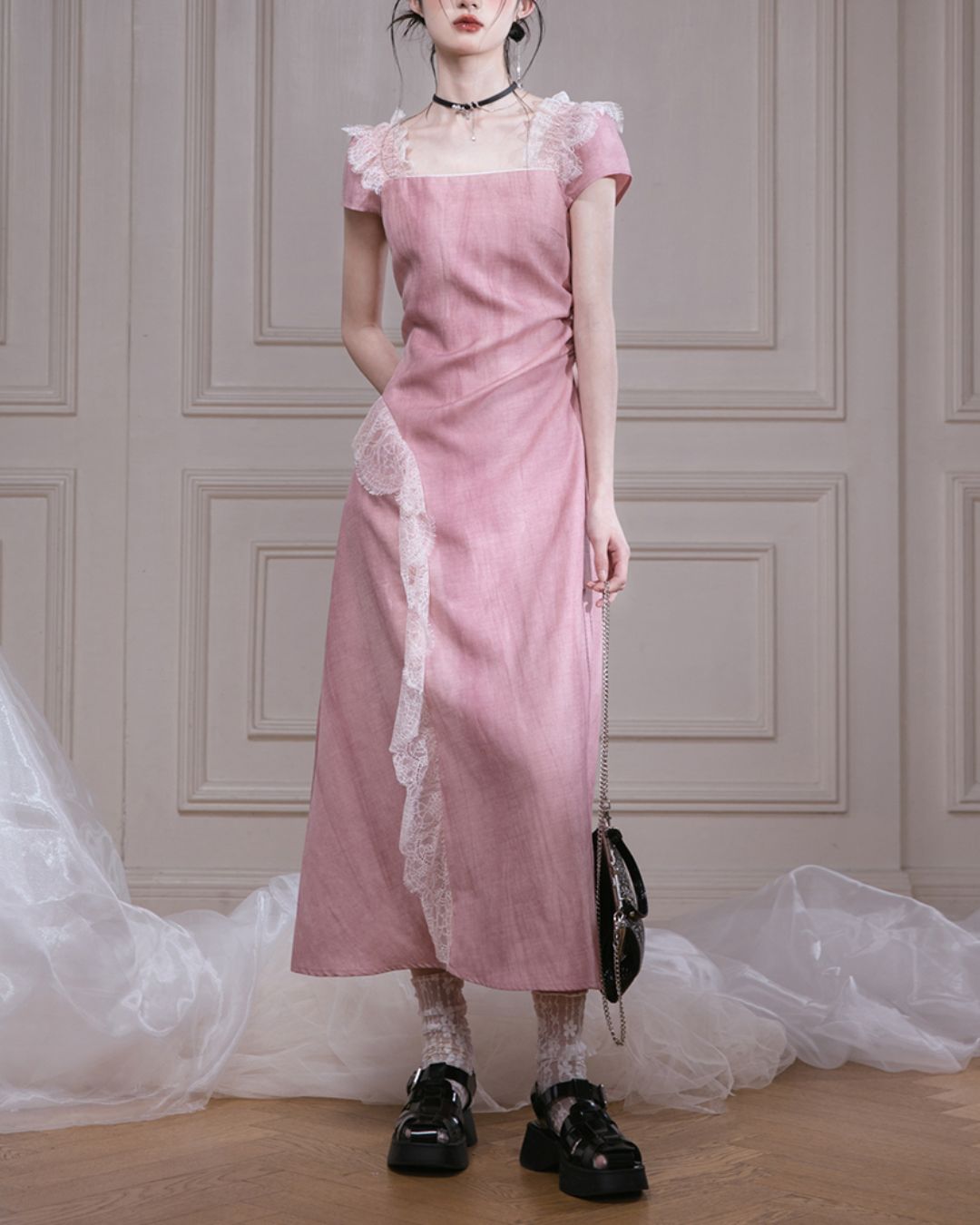Side Waist Drawstring Lace Embellished Long Dress DR042