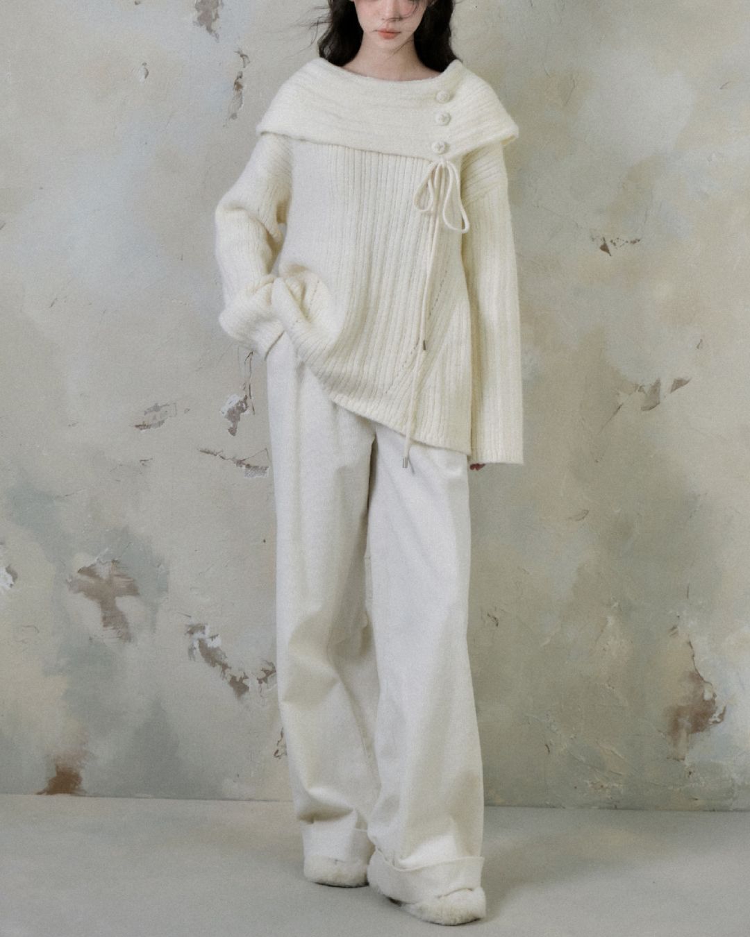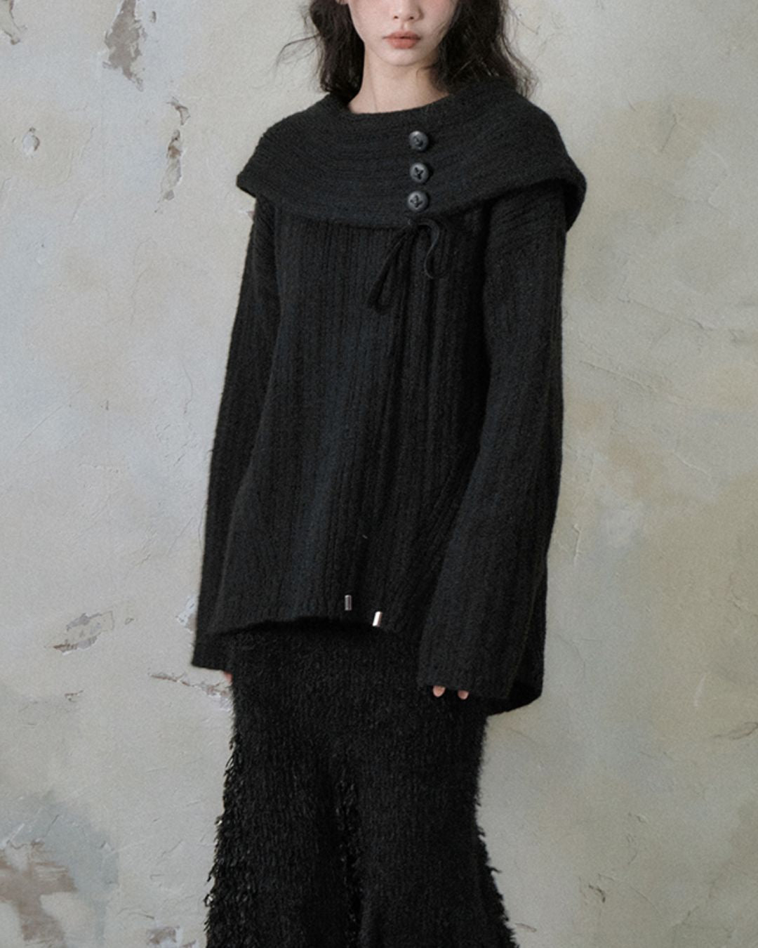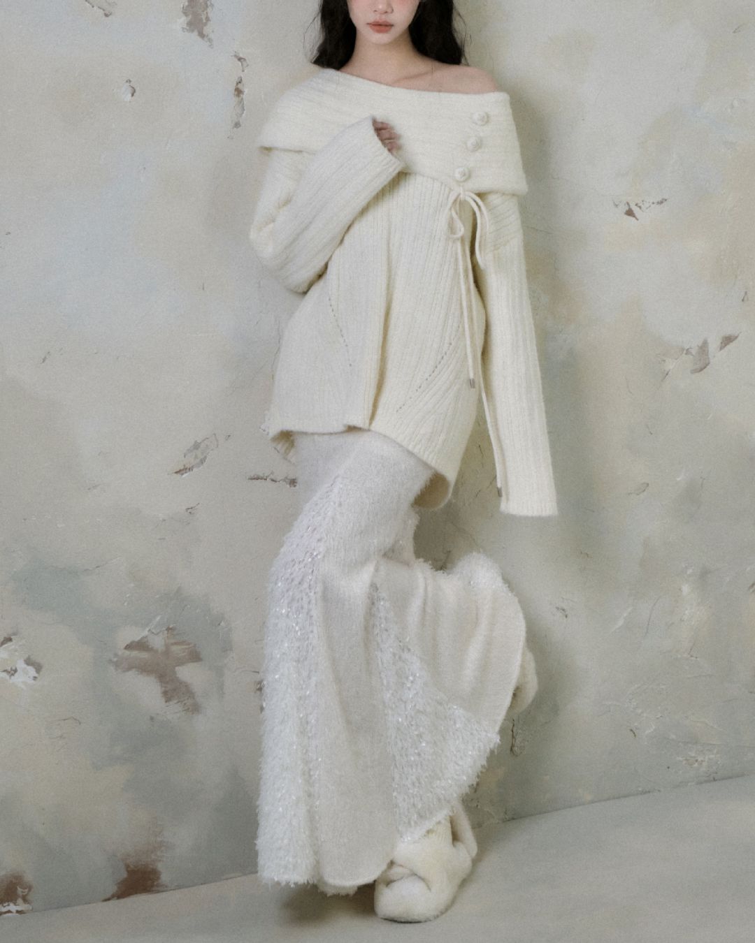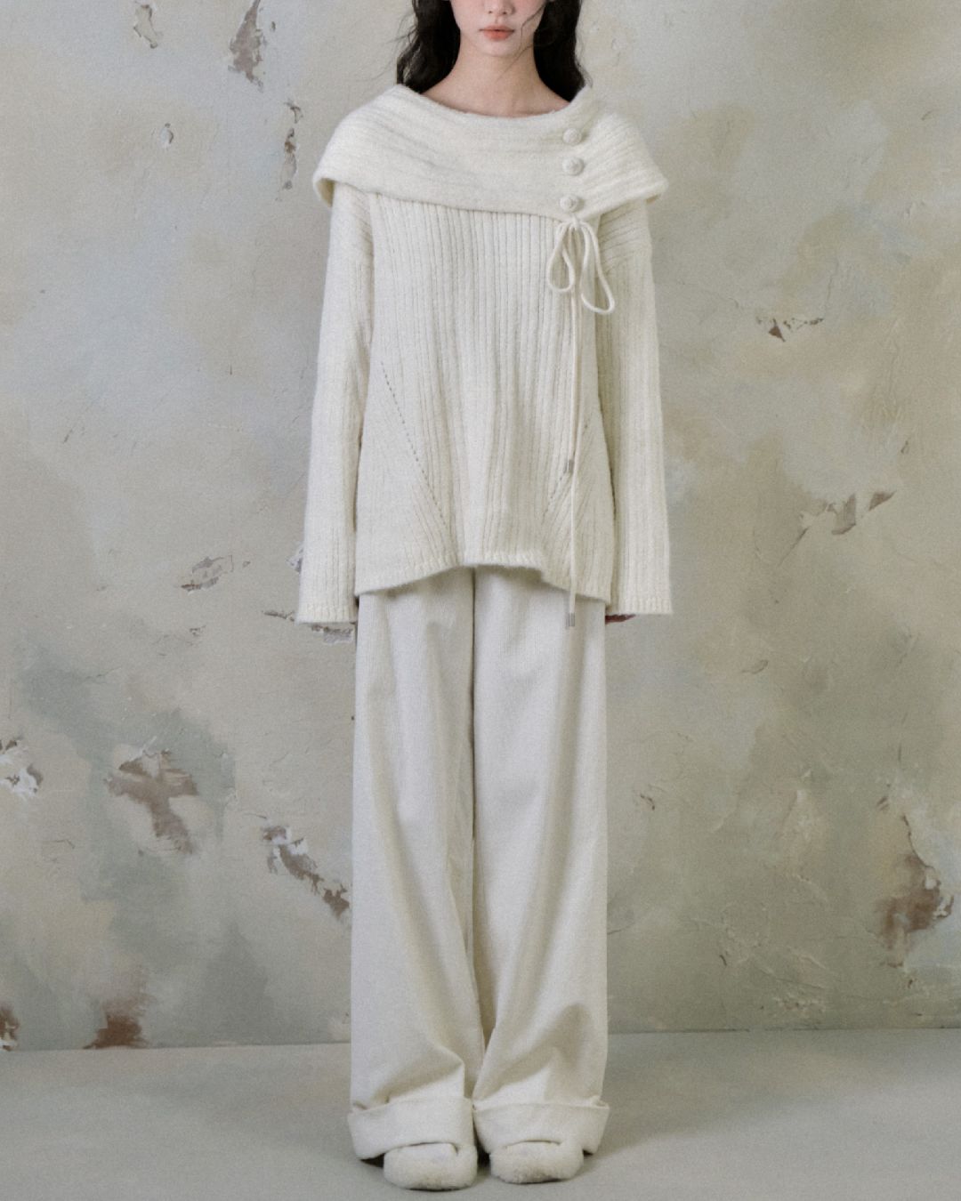 Button Ribbon Off Shoulder Knit TP022